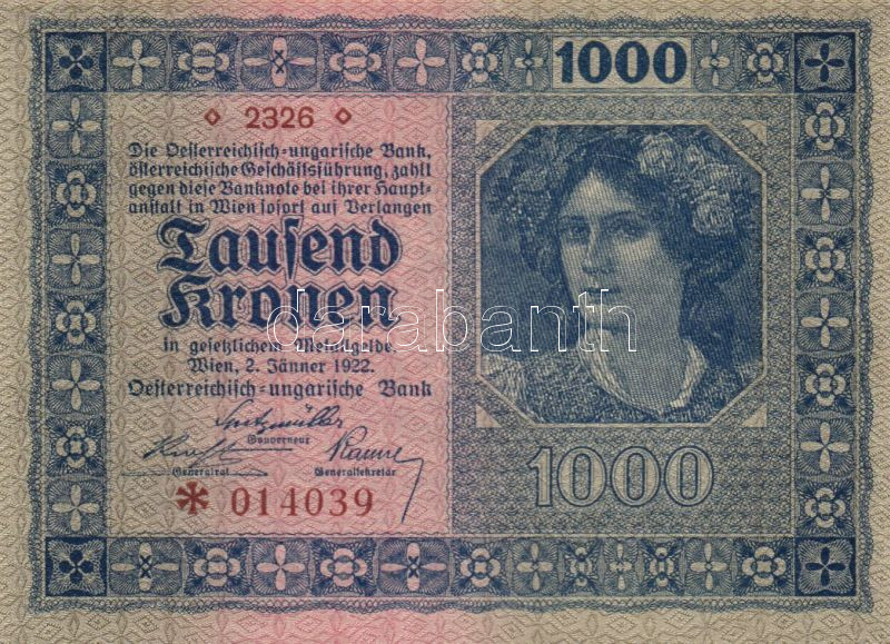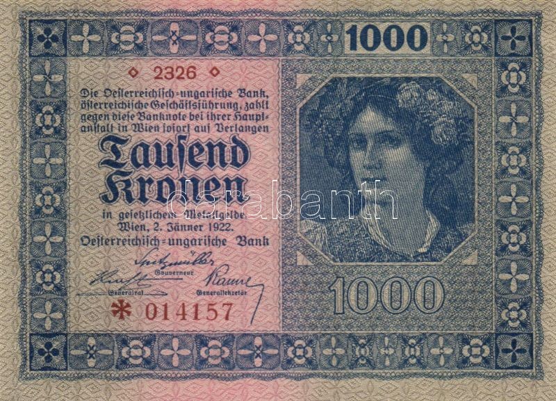 https://www.darabanth.com/en/139-Online-auction/139.0/Numismatics/Hungarian-banknotes~10008/Osztrak-Magyar-Bank-1922-1000K-2x-TI~II406012