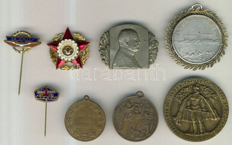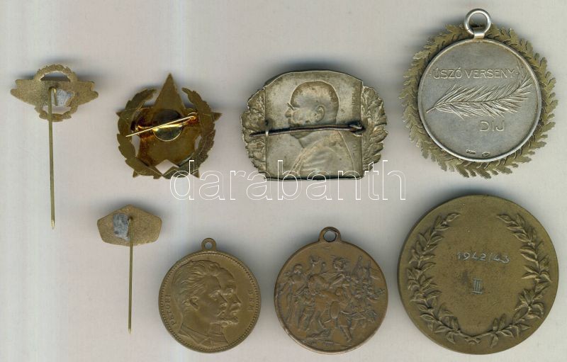 Vegyesk díjérem, kitűző és medál tétel, benne: "Balaton" úszók egyesülete 1900. fémjelzett ezüst érem, 1942. Közszolgálati Alkalmazottak Nemzeti Szövetsége érem T:vegyes