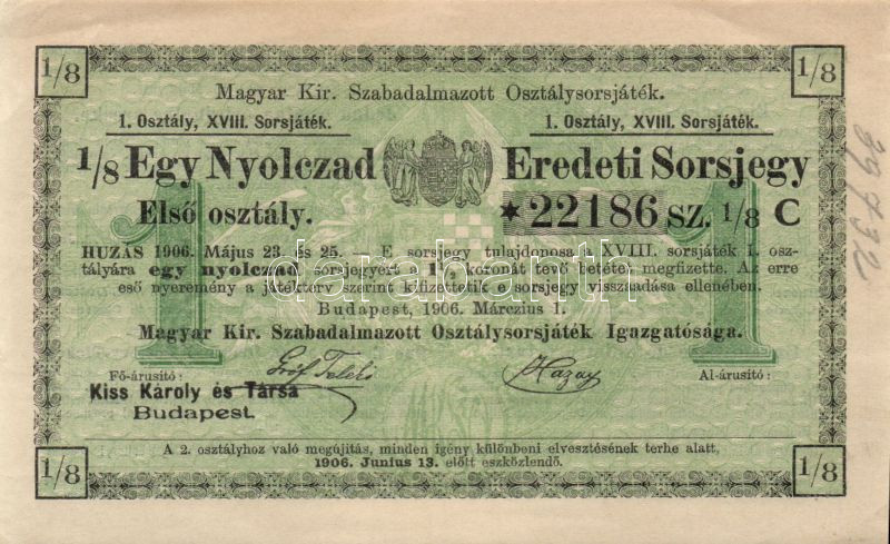 1906. Magyar Kir. Szabadalmazott Osztálysorsjáték első osztály XVIII. ...