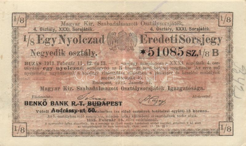 https://www.darabanth.com/en/139-Online-auction/139.0/Numismatics/Shares-Securities-and-Tickets~10006/1913-Magyar-Kir-Szabadalmazott-Osztalysorsjatek-negyedik-osztaly-egy-nyolcad-sorsjegye-5K-TII~II403992