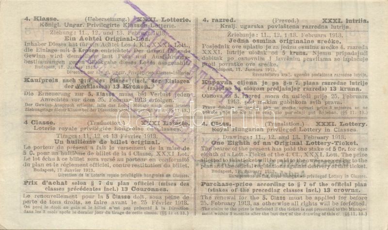 1913. Magyar Kir. Szabadalmazott Osztálysorsjáték negyedik osztály egy...