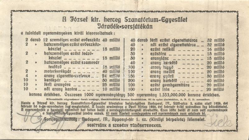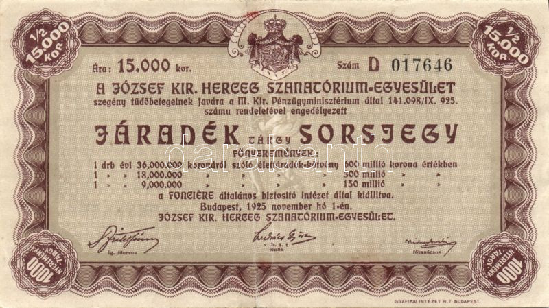 https://www.darabanth.com/en/139-Online-auction/139.0/Numismatics/Shares-Securities-and-Tickets~10006/1925-A-Jozsef-Kir-Herceg-Szanatorium-Egyesulet-jaradek-sorsjegye-15000K-TII-~II404138