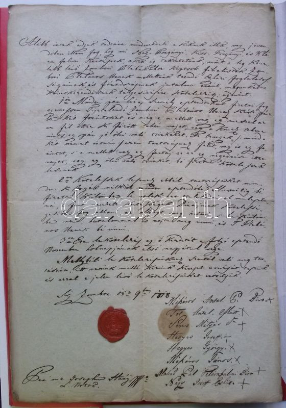 Description: 1818 A porgányi és klárafalvai kertészek Önkéntek felajánlása a zombori plébániának fizetendő évi juttatásokról, Szombor városa, a szombori valamint az apátfalvai plébános viaszpecsétjével
