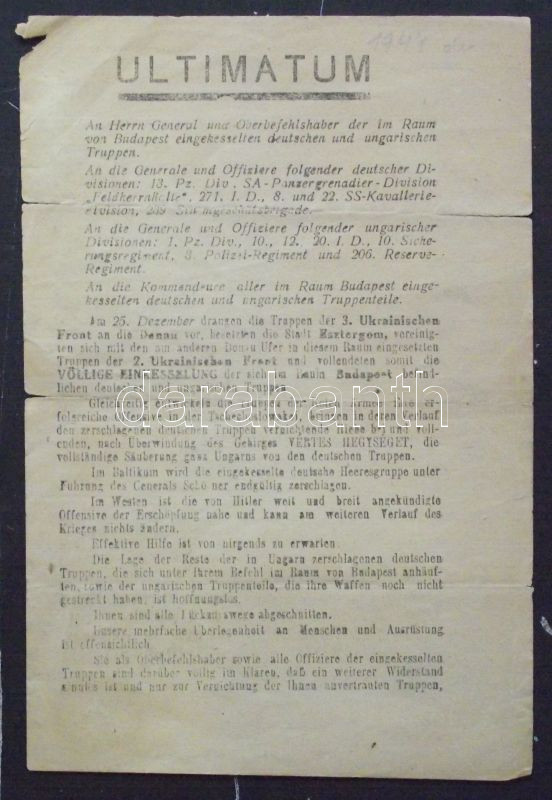 1944. december 29. Budapest német védőinek szórt röplap Malinovszky ma... https://www.darabanth.com/en/139-Online-auction/139.0/Other-collectibles/Historical-documents-manuscripts~11005/1944-december-29-Budapest-nemet-vedoinek-szort-roplap-Malinovszky-marsall-ultimatumaval-F~II405072