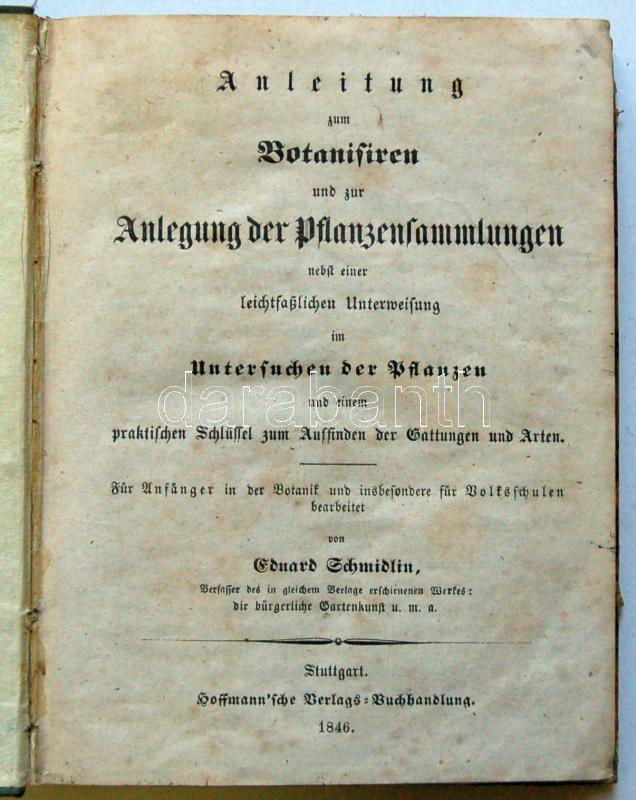 Description: Schmidlin, Eduard.: Anleitung zum Botanisiren und zur Anlegung der Pflanzensammlungen... Stuttgart, Hoffmann'sche Verlags-Buchhandlung. 1846. 408p.Papírkötésben / in paper-binding