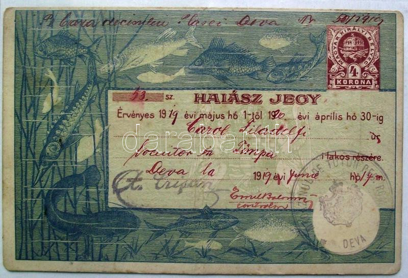 1919 4K értékbenyomású Halászjegy a román megszállás alatt levő Déván ... https://www.darabanth.com/en/14-Major-auction/14.1/Art-and-collectibles/Documents~4103/1919-4K-ertekbenyomasu-Halaszjegy-a-roman-megszallas-alatt-levo-Devan-felhasznalva-Fis~II535009