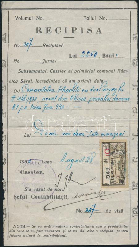 Description: Románia 1930-1941 Ramnicu Sarat a helyi zsinagóga által kiadott 3 nyugta, elismervény városi okmánybélyegekkel / 3 documents of the local synagogue with municipal revenues