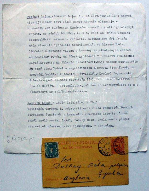 Description: 1894. március 28. Terényi Lajos 1848-as politikus, Békés megyei alispán saját kézzel írt levele Dutkay Béla gyulai polgármesternek, melyben értesít arról, hogy az egy héttel korábban elhunyt Kossuth Lajos torinói ravatalára a koszorút letette és a város részvétét Kossuth Ferencnek átadta /
