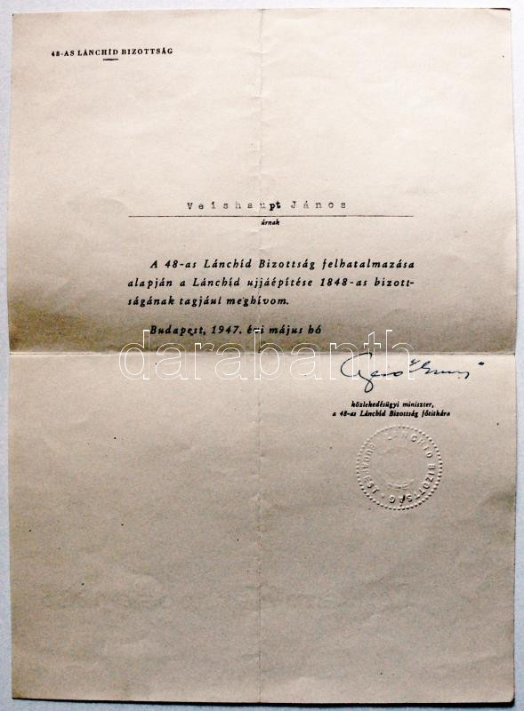 Description: 1947 Gerő Ernő közlekedésügyi miniszter, a Lánchíd-Bizottság főtitkára által aláírt meghívó levél a bizottságba /