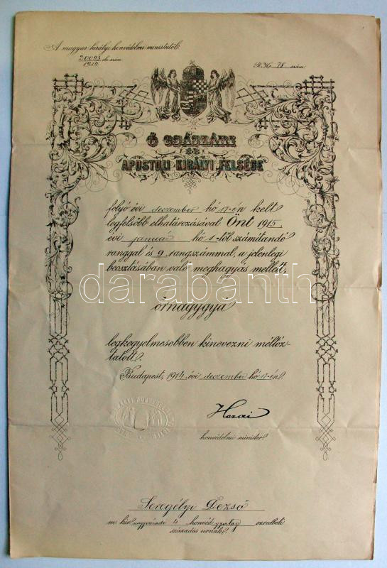 Description: 1914 Seregély Dezső őrnagyi kinevezése Hazai Samu honvédelmi miniszter bélyegzett aláírásával /