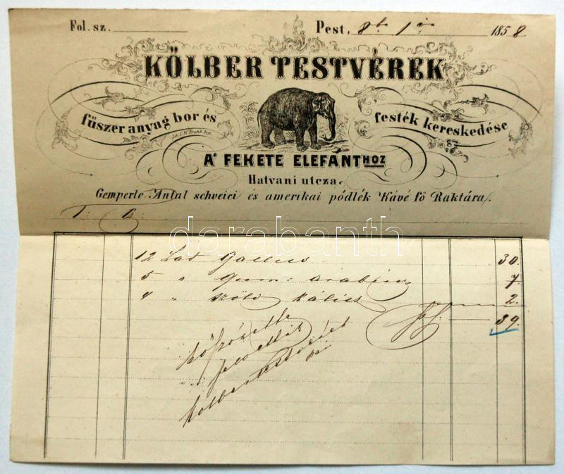 1858 A Kölber testvérek A' Fekete Elefánthoz címzett fűszer-, bor- és ... https://www.darabanth.com/en/14-Major-auction/14.1/Art-and-collectibles/Printed-Materials~4105/1858-A-Kolber-testverek-A-Fekete-Elefanthoz-cimzett-fuszer--bor-es-festekkereskedesenek-~II542909