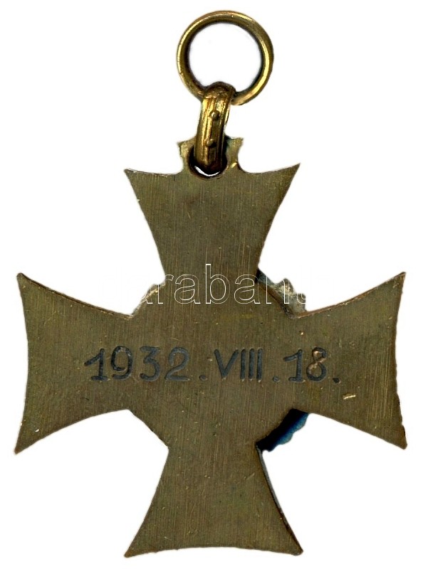Description: 1932. "II. Osztályú Tiszti Szolgálati Jel" aranyozott Br kereszt szalag nélkül, hátlapon vésett "1932.VIII.18." dátum T:2-