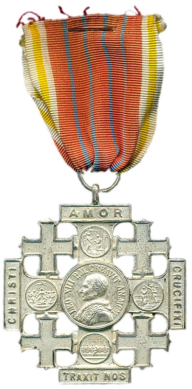 Vatikán 1901-1977. "A Szent Föld Ezüst Érdemérme (Jeruzsálem Kereszt)" kitüntetés mellszalaggal, a középső medalion "800"-as ezüstjelzéssel és XIII. Leó Pápa arcképével. "CHRISTI AMOR CRUCIFIXI TRAXIT NOS / SIGNUM SACRI ITINERIS HIERSOL (42.5mm/Br.:19.94g) T:2 /