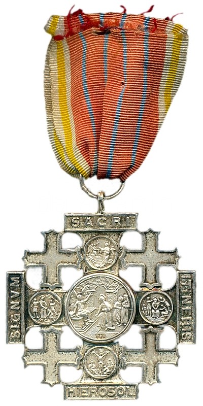 Vatican 1901-1977 "Silver Medal of the Holy Land (Jerusalem Cross)" with ribbon and silver "800" mark on the central medallion of the reverse. The medal was established by Pope Leo XIII. Inscriptions: "CHRISTI AMOR CRUCIFIXI TRAXIT NOS / SIGNUM SACRI ITINERIS HIERSOL (42.5mm/Br.:19.94g) C:XF