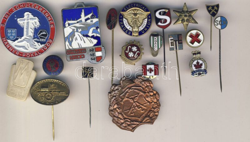 18 db különböző kitűző és jelvény, közte több külföldi zománcozott darab is T:2,2- (egyiknek hiányzik a tűje)