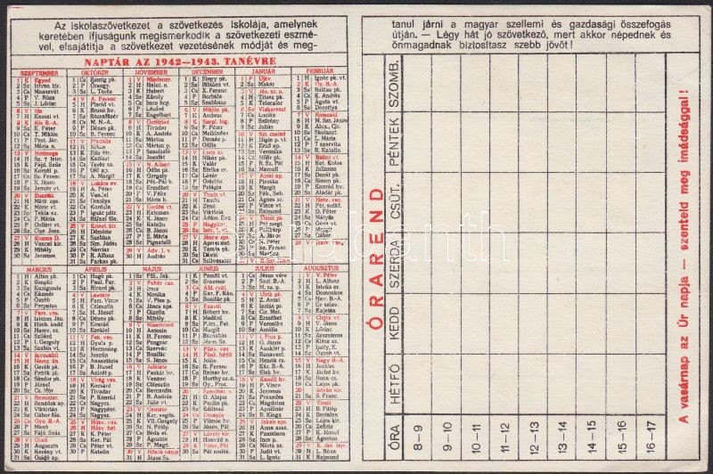 1942/1943 Iskolaszövetkezeti Naptár-Órarend