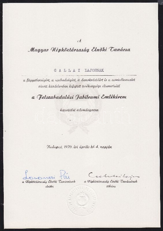 https://www.darabanth.com/en/140-Online-auction/140.0/Other-collectibles/Signature~40006/1970-Felszabadulasi-emlekerem-adomanyozo-levele-es-a-viselesere-jogosito-igazolvany-Loson~II412925
