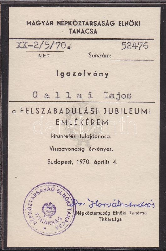 1970 Felszabadulási emlékérem adományozó levele és a viselésére jogosító igazolvány Losonczi Pál, az Elnöki Tanács Elnökének saját kezű aláírásával
