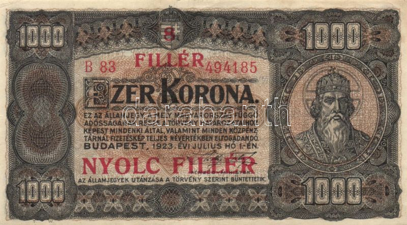https://www.darabanth.com/en/141-Online-auction/141.0/Numismatics/Hungarian-banknotes~10008/1923-1000K-piros-8-FILLER--NYOLC-FILLER-felulbelyegzessel-TII-~II406240