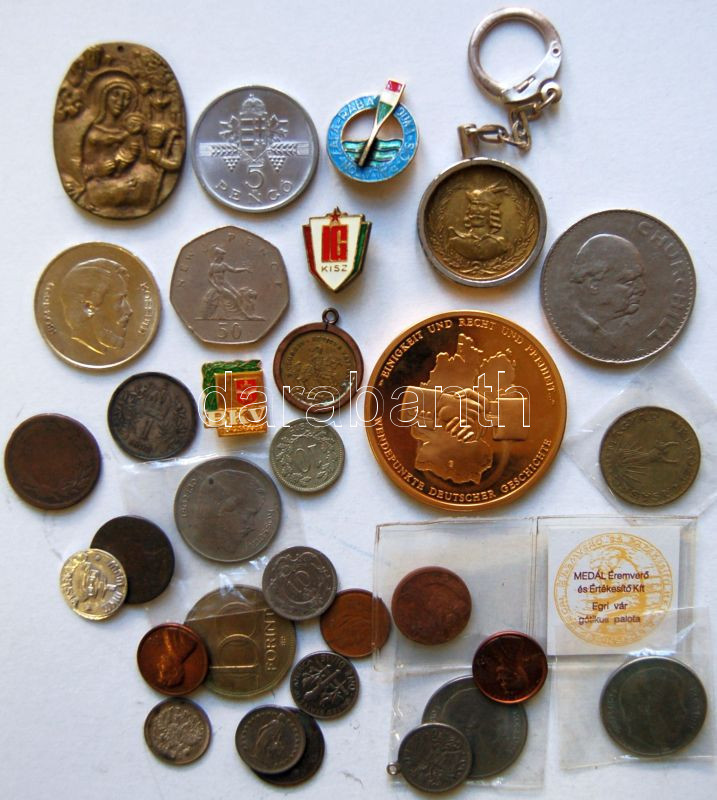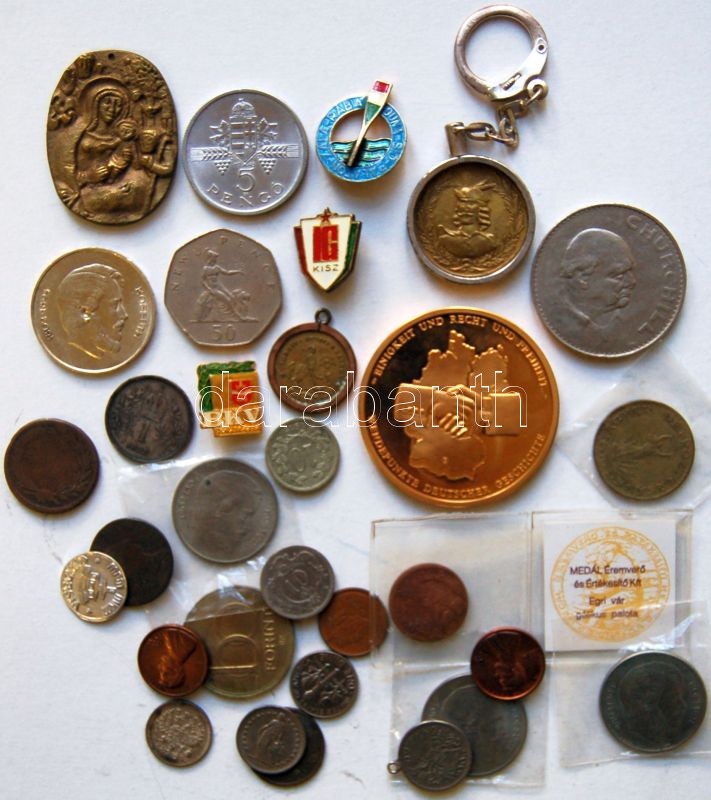 Kis vegyes tétel: magyar és külföldi fém- és ezüstpénzek, kitűzők, emlékérmek T:vegyes