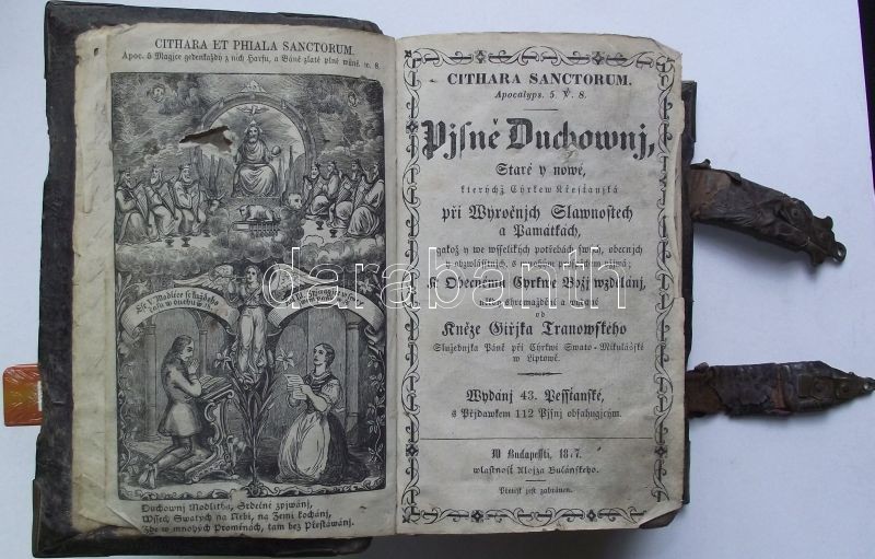 Cithara Sanctorum Pisné Duchownj, Staré y Nové... Knéze Giřjka Tranowského.., Pest, 1877. Bucsánszky, ellegzetes „Szlovák Biblia” kötésben: bordázott egészbõr, díszes rézborítású kötéstáblákkal, rézcsatokkal (2 kapocs hiányzik) (e1-2 sérült oldal) 1246p. Hozzákötve: Modlitby Nábozné... 110p.