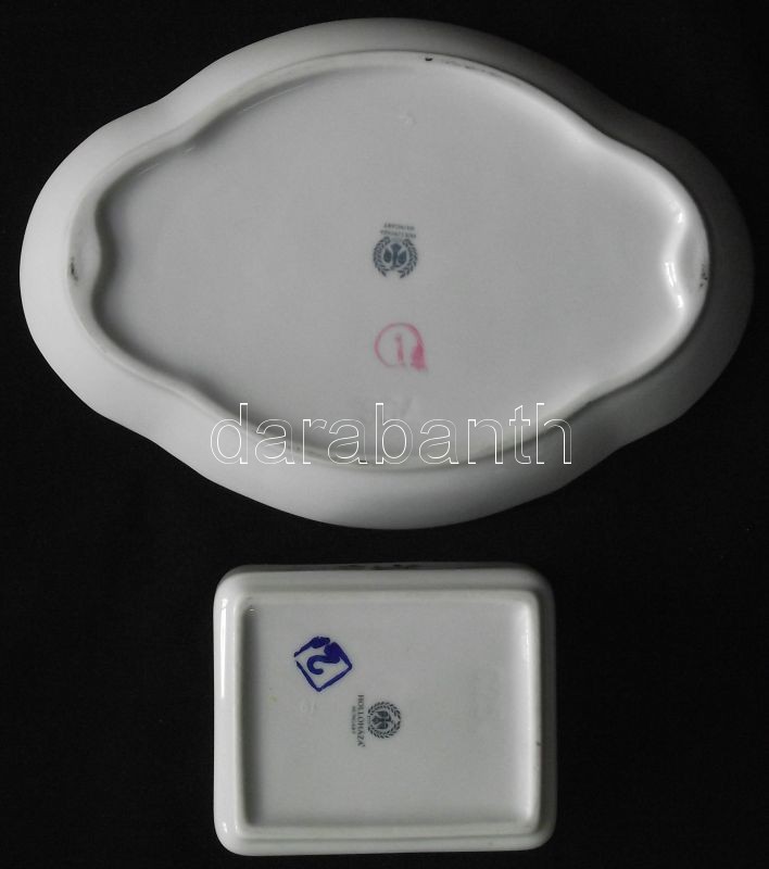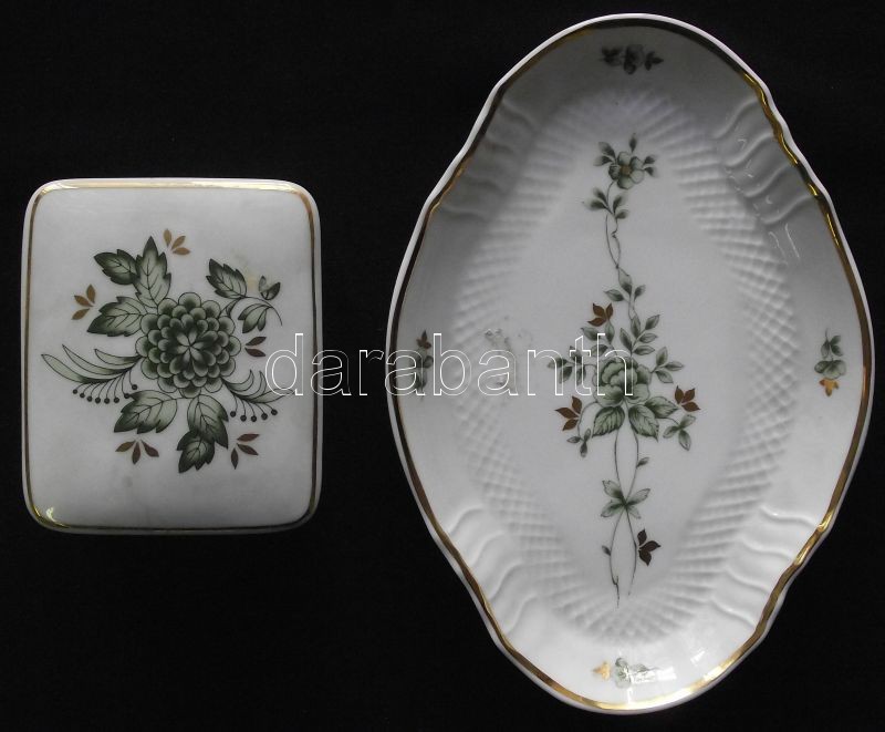 Hollóházi porcelán tál és bonbonier virágokkal díszítve, jelzett / Hollóházi chinaware bowl (18x13 cm) and bonbonier (9x7x4 cm)