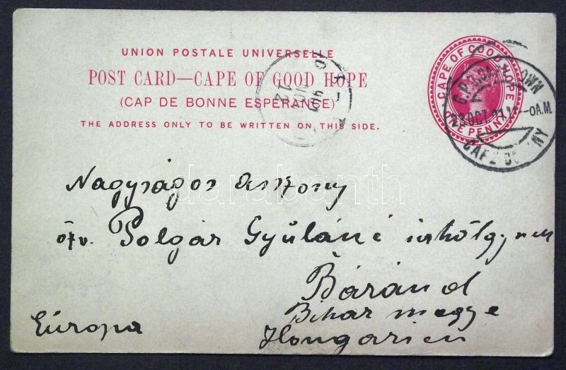 1901 Díjjegyes képeslap Cape Townból Bárándra, az üzenetben a búr hábo... https://www.darabanth.com/en/141-Online-auction/141.0/Other-collectibles/Historical-documents-manuscripts~20005/1901-Dijjegyes-kepeslap-Cape-Townbol-Barandra-az-uzenetben-a-bur-haborura-torteno-utalC3~II409479