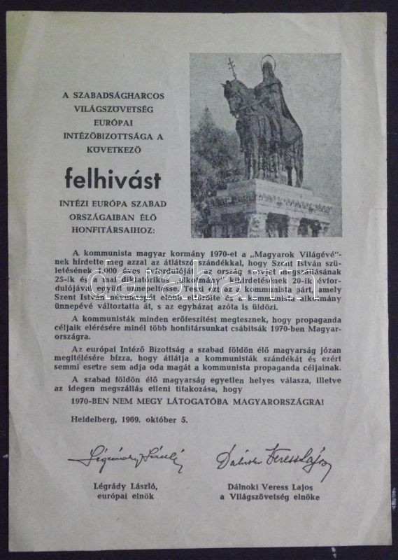 1970 Szabadságharcos világszövetség felhívása Magyarország bojkottjára...