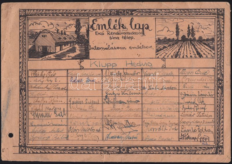 cca 1949 Ercsi rendőrgazdaság Sina telep internálási emléklap az internáltak aláírásával 18x25 cm