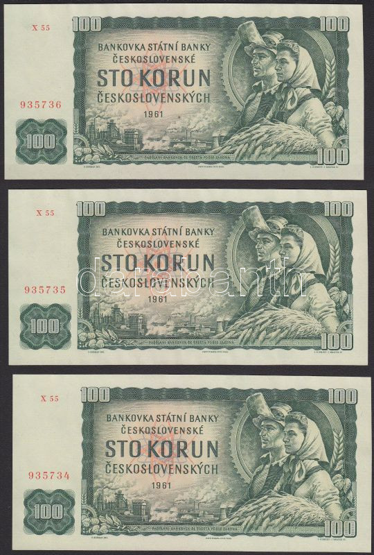 Csehszlovákia 1961. 100K "X 55" széria (3x) egymást követő sorszámmal ...