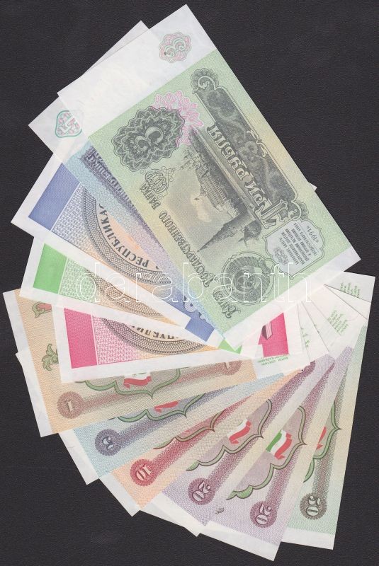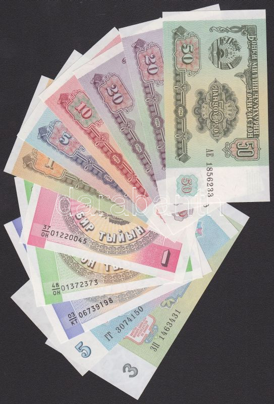 Kirgizisztán 1993. 1T + 10T + 50T + Szovjetunió 1991. 3R + 5R + Tadzsikisztán 1994. 1R, 5R, 10R, 20R(2x), 50R T:I