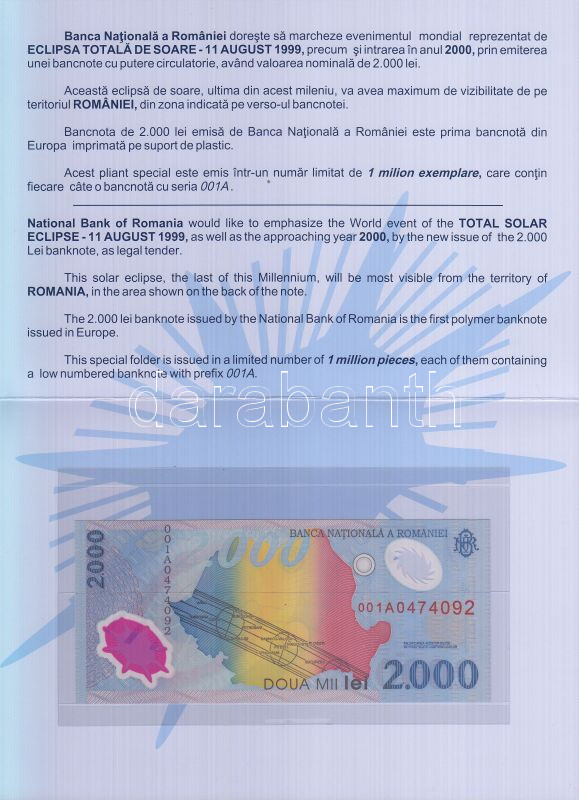 https://www.darabanth.com/en/142-Online-auction/142.0/Numismatics/Foreign-banknotes~1500012/Romania-1999-2000Lei-3x-Napfogyatkozas-diszkiadas-egymasutani-sorszammal-emleklapon-T~II405379