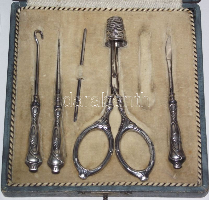 XIX. század vége: 6 darabos ezüst horgoló és varró-készlet eredeti kem...