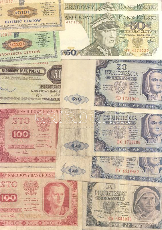 Lengyelország 1948. 20Zl (3x) + 50Zl + 100Zl (2x) + 1988. 50Z (2x) + 100Zl + 1969. ajándékutalvány 0,1$ + 0,2$ értékben + 1981. Üdülési csekk 500Zl értékben T:I,II,III