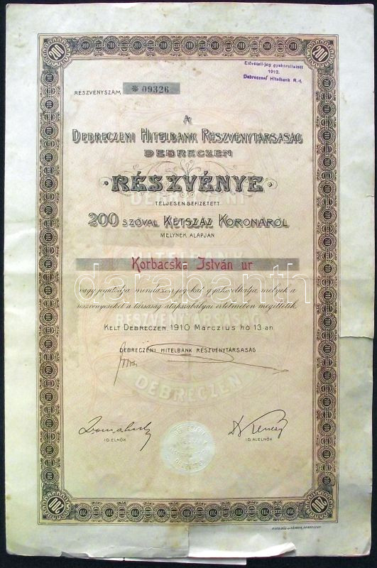 1910. "Debreczeni Hitelbank Részvénytársaság" részvénye 200K-ról, szel...