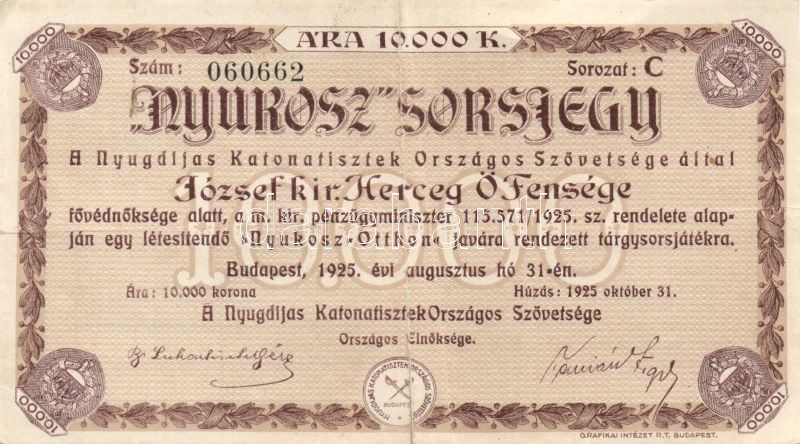 https://www.darabanth.com/en/142-Online-auction/142.0/Numismatics/Shares-Securities-and-Tickets~1500006/1925-10000K-NYUKOSZ-sorsjegy-TIII-kis-szakadas-plus-1925-Orszagos-Iparegyesulet-altal-rendez~II420551