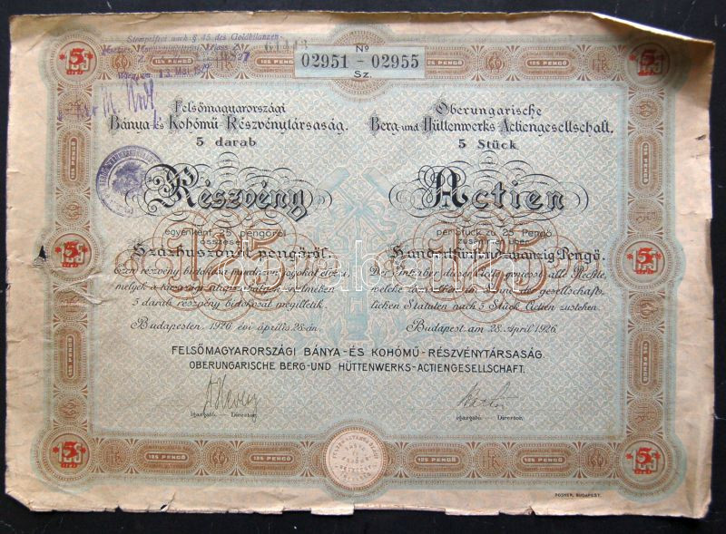 1926. "Felsőmagyarországi Bánya- és Kohómű Részvénytársaság" részvénye 125P-ről, német és magyar nyelven