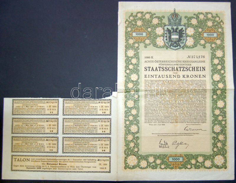 Ausztria 1918. Nyolcadik osztrák Hadikölcsön kötvény 1000K-ról