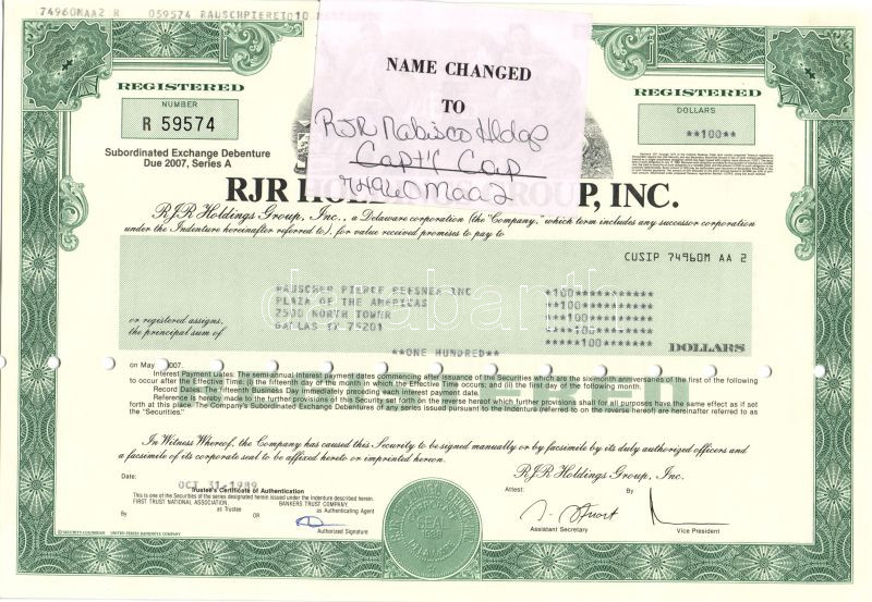 USA / Delaware 1989. RJR Holdings Group Inc. dohány vállalat részvénye, névváltozás címkével (RJR Nabisco) T:I