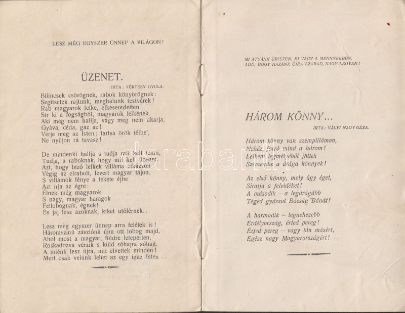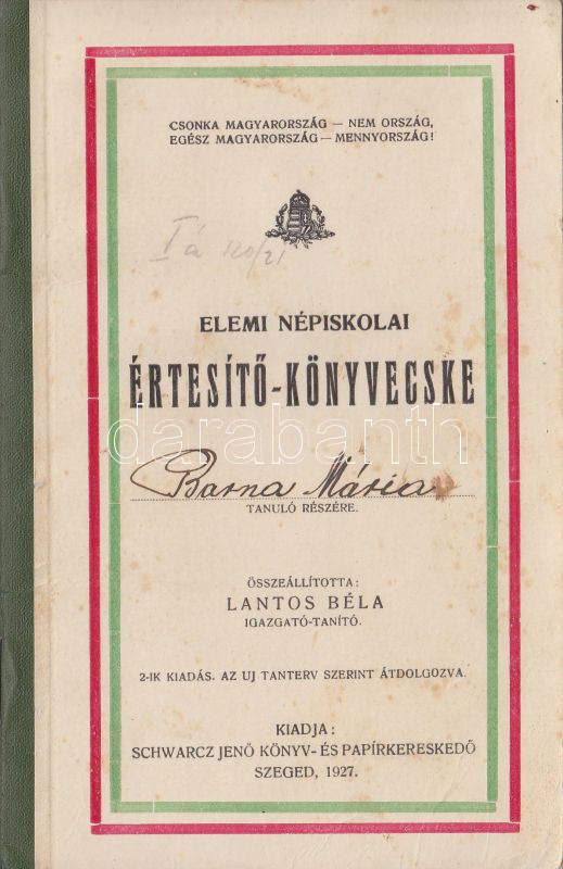 1927 Irredenta elemi sikolai bizonyítvány 4 klf. irredenta imával, Schwarcz Jenő papírkereskedése, Szeged