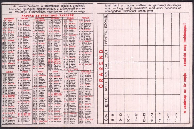 1942/1943 Iskolaszövetkezeti Naptár-Órarend
