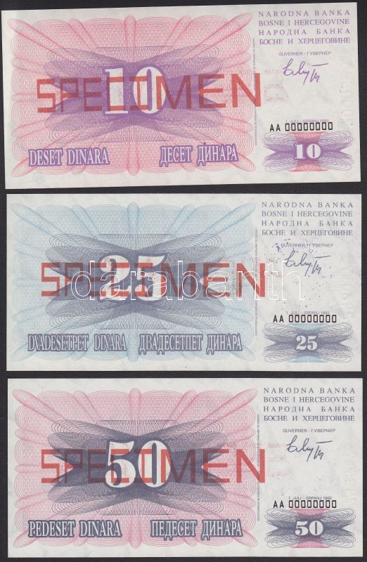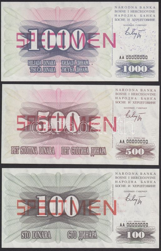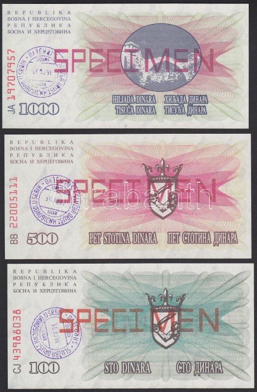Bosznia-Hercegovina 1992. 10D + 25D + 50D + 100D + 500D + 1000D "AA 00000000" sorozatszámmal, pecsételéssel és "SPECIMEN" felülnyomással! T:I