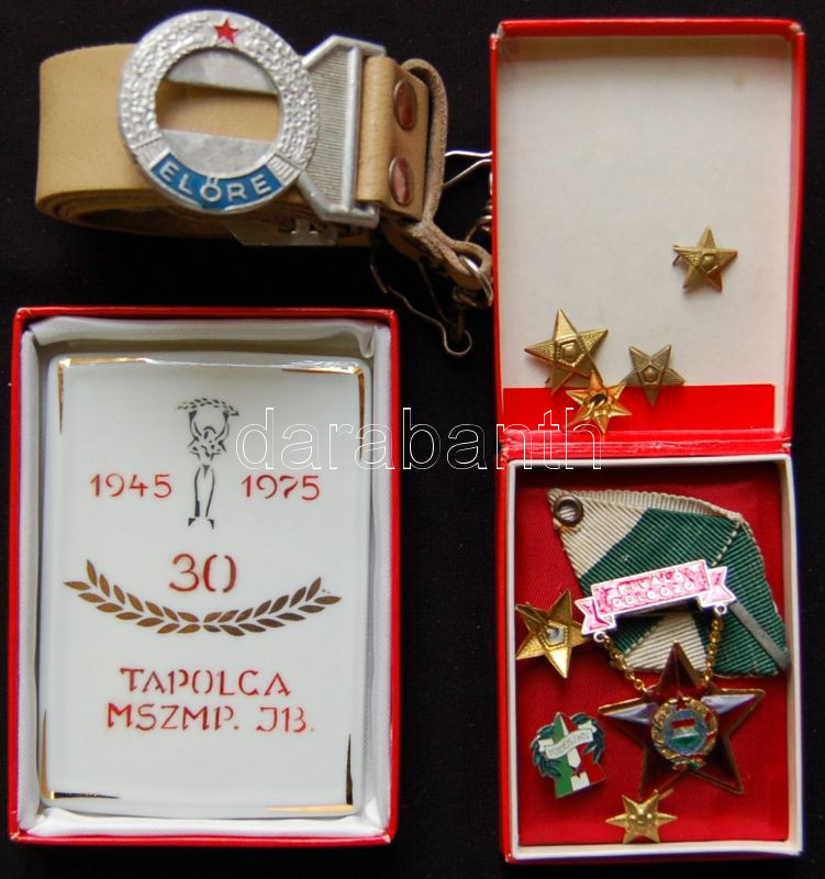 1975. Tapolcai MSzMP jubileumi porcelán plakett dísztokban + Kiváló dolgozó kitüntetés, törzsgárda jelvény, kitűzők + úttörő szíj T:vegyes
