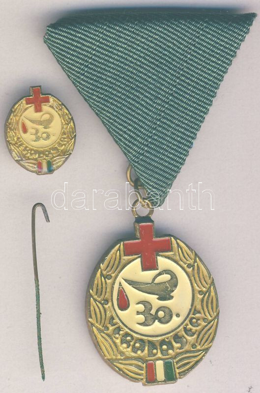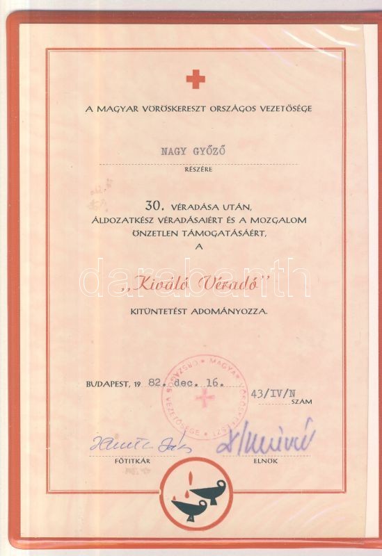 1982. 30. véradásért járó "Kiváló Véradó" kitüntetés eredeti díszdobozban kitűzővel és adományozó okirattal T:1 (kitűzőről letört a tű)