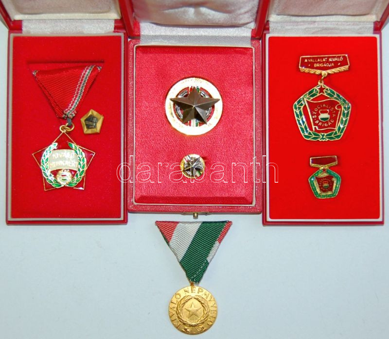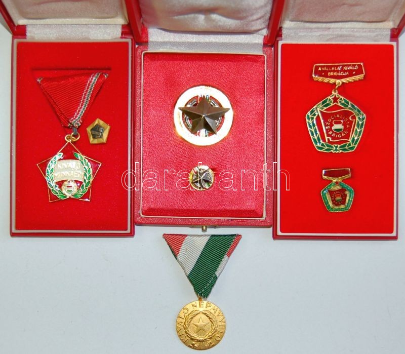Szocialista kitüntetések: "A Vállalat Kiváló Brigádja" kitűzÅ‘vel eredeti dÃszdobozban + "Kiváló Munkáért" eredeti dÃszdobozban + "A Kisipari Szövetkezet Kiváló Dolgozója" kitűzÅ‘vel eredeti dÃszdobozban + "Kiváló NépművelÅ‘ mellszalaggal T:1
