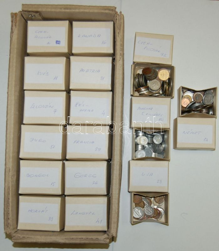 Description: Vegyes fémpénz gyűjtemény, összesen majdnem 1000db pénzérme közel 30 különböző ország(főleg Európa)pénzével, kis kartondobozokba rendezve országok szerint, érdemes megnézni T:vegyes