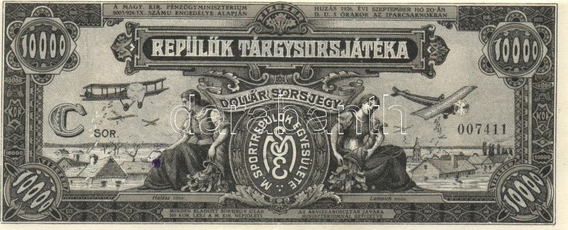 1926. "Repülők tárgysorsjátéka" 10.000K dollár sorsjegy. "C sor" hátoldali 80f felülbélyegzéssel T:II