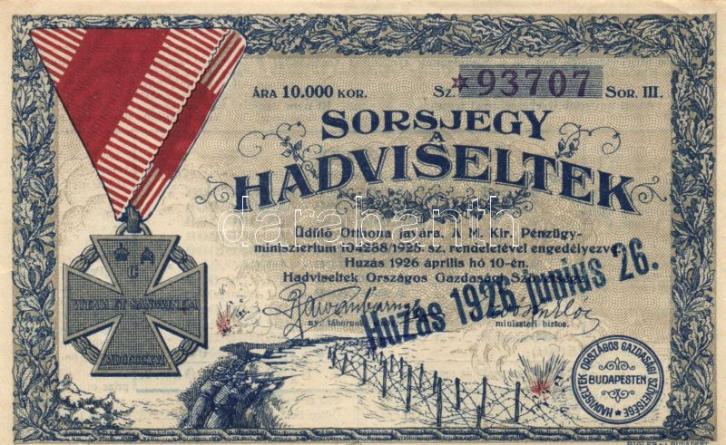 https://www.darabanth.com/en/143-Online-auction/143.0/Numismatics/Shares-Securities-and-Tickets~900099/1926-Sorsjegy-a-Hadviseltek-Udulo-Otthona-javara-10000K-ertekben-TII-kis-szakadas~II423300