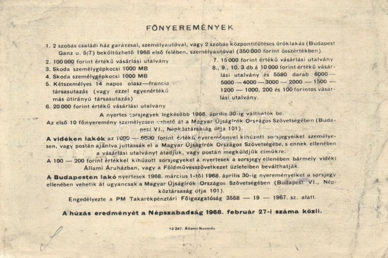 https://www.darabanth.com/en/143-Online-auction/143.0/Numismatics/Shares-Securities-and-Tickets~900099/1968-Szerencse-Sorsjegy-4Ft-a-Magyar-Ujsagirok-Orszagos-Szovetsege-altal-rendezendo-sors~II423304