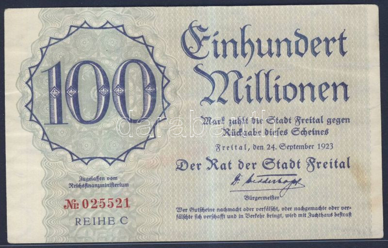 Német Birodalom/Weimari Köztársaság/Freital 1923.9.24. 100.000.000M T:II-
